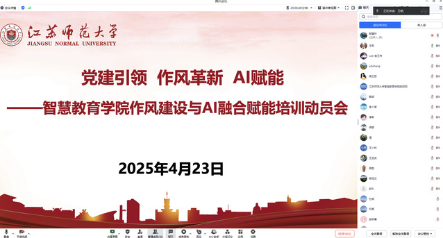 为贯彻新时代党的建设总要求,推动教职工数字素养与行政效能双提升,智慧教育学院创新推出“党建引领 作风革新 AI赋能”作风建设与AI融合赋能系列培训。4月23日-24日,学院以线上线下相结合的形式,举办培训动员会暨首期专题课程,正式开启为期一个月、共12场的系统培训。学院全体行政人员、支部书记、教师代表参与。