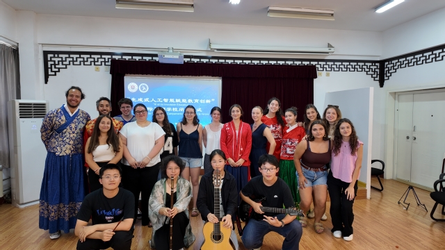在闭营演出环节,中外青年联袂献上了一场精彩纷呈的文化盛宴。演出内容丰富多元,既有传统乐器箫演奏,尽显东方韵味,也有现代电吉他表演,洋溢着青春活力。此外,现场还有行云流水的书法展示,而外国青年带来的舞蹈《玛卡雷娜》,更是以热情奔放的舞姿将全场气氛推向高潮。最后,一首悠扬的歌曲《Un beso y una flor》缓缓响起,成为连接中外友谊的纽带。尽管大家说着不同的语言,但此刻的共鸣与这份宝贵的经历,都值得所有人共同铭记。