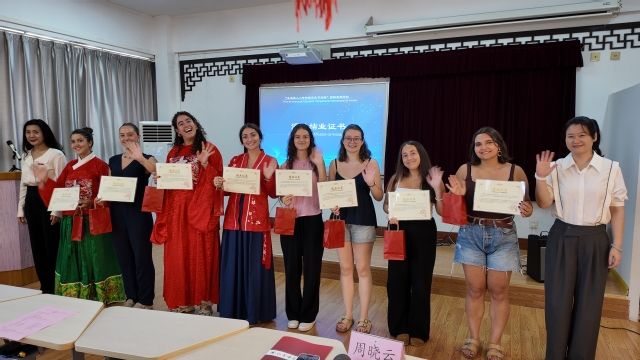 仪式开始,全体人员共同观看了暑期学校纪念视频。短短几分钟的影像浓缩了22天的研学点滴。从汉画像石的历史底蕴到生成式人工智能的前沿探索,从课堂学习到文化体验,画面生动再现了中外青年在徐州的成长与收获,唤起了在场所有人的共同记忆。随后,青年学员代表先后发言。他们分享了对徐州两汉文化的深刻感悟,讲述了在生成式人工智能课程中的探索与突破,坦言此次研学是一次前所未有的体验,感受到了传统与创新交织的独特魅力。“这是知识的碰撞,更是心灵的相遇”,一位学员的感慨道出了大家的心声。周晓云在致辞中对顺利结业的学员表示祝贺。她指出,本次暑期学校以“生成式人工智能赋能教育创新”为主题,既搭建了前沿科技的交流平台,也架起了文明互鉴的桥梁。希望中外青年能将这段经历转化为持续交流的动力,成为跨文化理解的使者。仪式上,周晓云与武悦随后为学员逐一颁发结业证书,见证他们的研学成果。学院还精心准备了融合徐州元素的纪念品,寄托着对学员的美好祝愿。