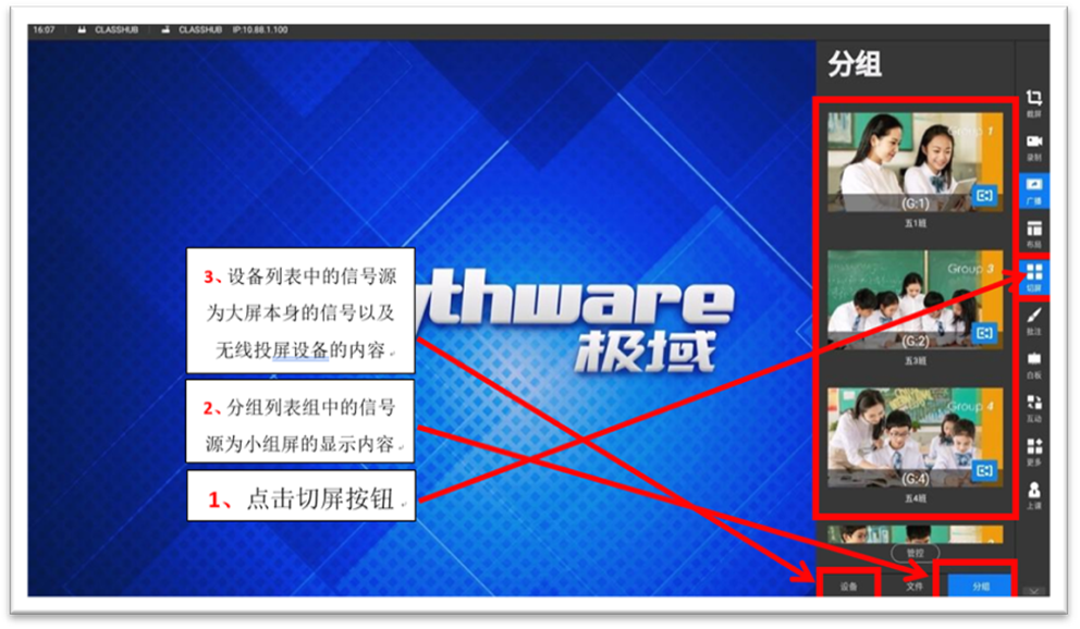 (4)屏幕广播。仅在教师屏可以使用此功能,将教师屏显示内容同步显示给其他小组屏。