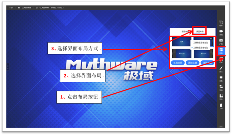 (3)界面布局。包括全屏、显示工具条、研讨(左)、研讨(右)共计4种布局模式,其中显示工具条模式可选择工具条显示在左边或右边。