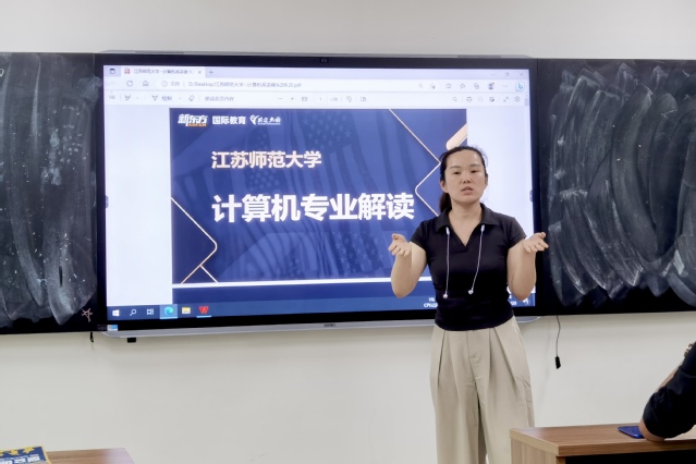 本次活动特邀徐州新东方前途出国陈岑和时维巍老师,从热门留学国家概况、考研留学同步规划、高效备考雅思、出国读博等几方面,展开了具体的介绍。老师们分析了计算机相关专业的就业现状,鼓励同学们提前规划,提升自身能力,充分发挥专业优势。重点阐述了雅思和托福的重要性,并从考试题型、成绩计算、时间分配、考情分析、学习路径、教材推荐等方面进行了普及。最后两位老师与参会学生互动交流,耐心解答了同学们的疑难困惑。