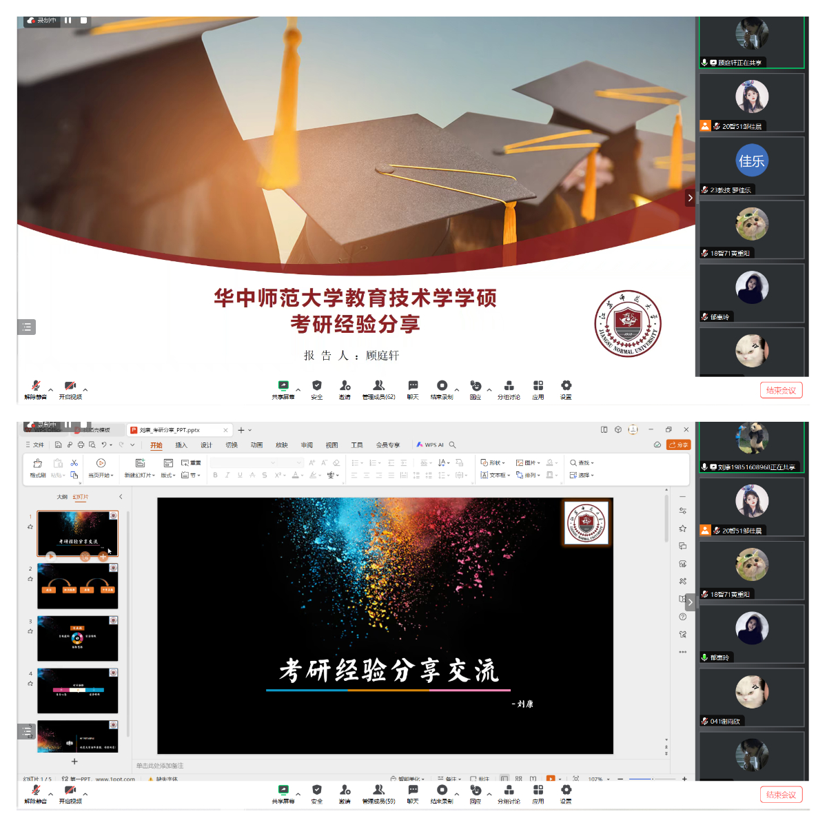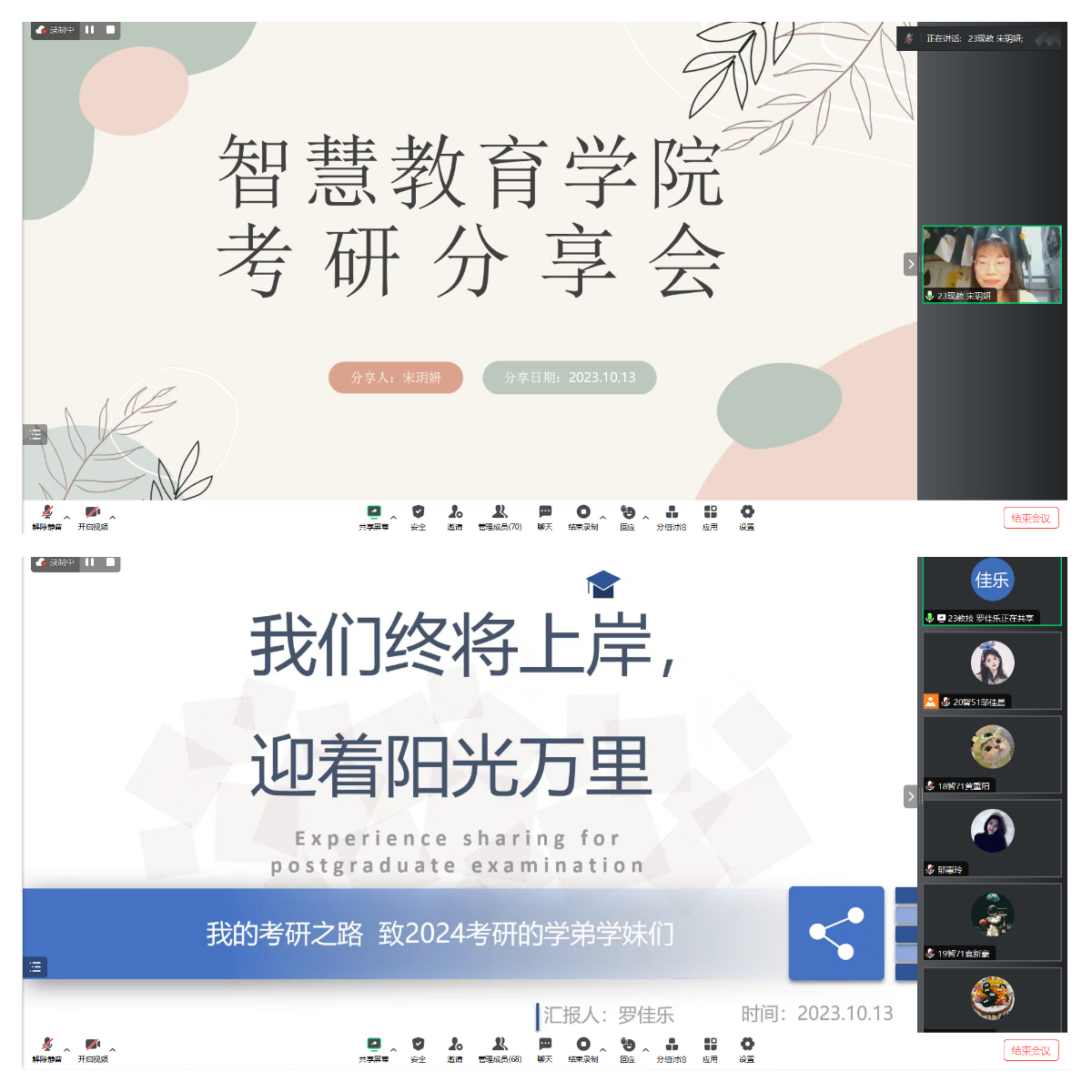 为了帮助同学们更好地了解考研形势,确立合适的考研目标,及时调整备考安排,智慧教育学院于10月13日晚上7点半召开了线上考研经验分享会。本次会议由就业辅导员郁惠玲老师主持,在前期充分了解了考研学生拟报考情况后,分别邀请了考取相关学校和专业的李吉华、袁新豪、黄重阳、宋玥妍、罗佳乐、顾庭轩、刘康等7位毕业生分享备考经验,70余位20级和21级同学参会。