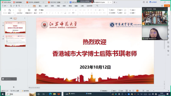 2023年10月12日上午在静远楼908,智慧教育学院邀请香港城市大学陈书琪博士做了一场题为“Distributed estimation design under resource-saving communication strategies”的学术报告。此次报告由我院刘小洋副院长主持,我院管理科学与工程、电子信息专业的部分研究生参加了本次报告。