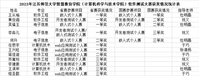 智慧教育学院(计算机科学与技术学院)研究生在本届比赛中取得了优异的成绩,省区级比赛中共获得一等奖7项,二等奖2项和三等奖4项,其中祝义老师指导的李淼儿同学在开发者测试和嵌入式测试中均获得一等奖,黄俊阁同学在开发者测试中获得一等奖,苏寓桁同学、李建豪同学在开发者测试中获得三等奖;杜明晶老师指导的吴福玉同学和王从瑜同学在嵌入式测试中获得一等奖,何升同学在嵌入式测试中获得二等奖;于巧老师指导的任思宇同学在web应用测试中获得一等奖,蒋佳漩同学在web应用测试中获得二等奖,程圣懿同学在web应用测试中获得三等奖。张清杨老师指导的王兴旺同学在web应用测试中获得一等奖。