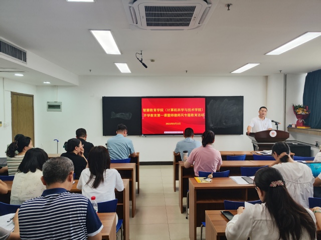 为提升新学期教职工士气,持续推动学院师德师风建设, 9月3日下午,智慧教育学院召开新学期全体教职工大会暨开学教育第一课活动,学院全体教职工参会,会议由学院党委书记周显洋主持。