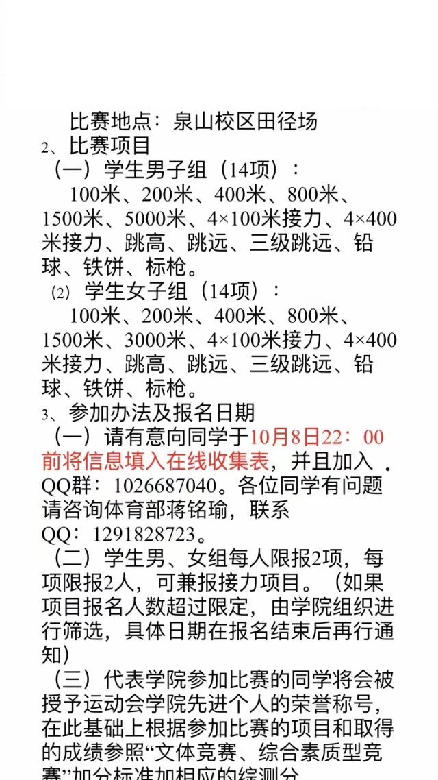 每年参加运动会的同学大多都是新生,仔细想一想,刚刚经历过高三那一年紧张而又艰苦的学习和生活的新生,理论上用于锻炼的时间应该没有已经在大学里的学生多,那为什么参加的又大多是新生呢?我想导致这一现象的原因不是身体机能的区别,而是精气神的区别。刚入校的新生对大学生活有憧憬、有好奇,因为这憧憬和好奇新生自身也更有朝气、活力和进取心,更勇于尝试。运动最大的魅力不是跑地有多快多长,跳地有多远多高,而是每一个人在运动过程中的挑战、坚持和超越,运动的是身体,磨练的是意志。所以衷心希望同学们无论是新生还是老生,都不要失去了憧憬、好奇、朝气、活力和进取心,无论运不运动,都要敢于挑战、善于坚持、勇于超越。