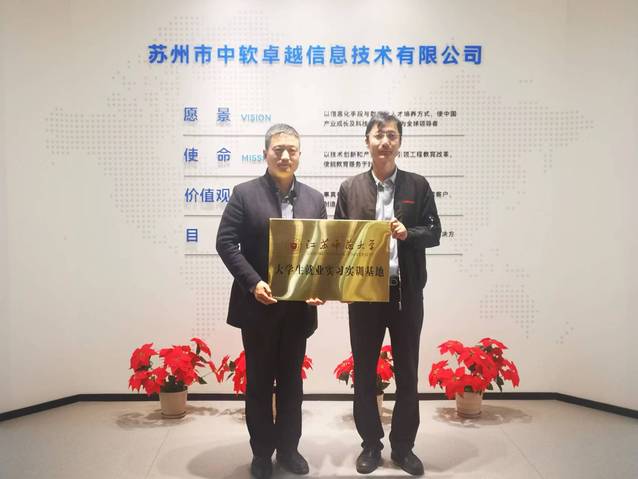 3月22日上午,周显洋书记一行前往昆山中迈信息科技有限公司、中软国际教育集团苏州基地参观座谈。周显洋书记与昆山中迈信息科技有限公司总经理、学院优秀校友戴文浩就如何发挥校友资源优势推动毕业生实习和就业等方面进行了交流。学院副院长祝义与中软国际教育科技股份有限公司高级副总裁姜军就推进落实深化产教融合、拓宽学生实习实训和就业渠道以及推动人才高质量培养等情况做了深度交流;并举行“江苏师范大学大学生就业实习实训基地”授牌仪式。
