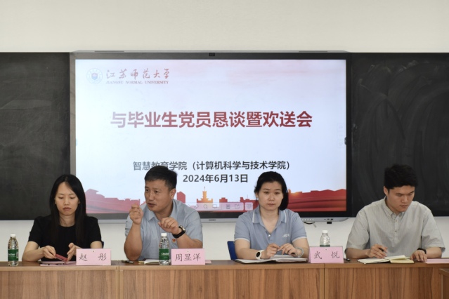 为营造温馨和谐的毕业氛围,引导毕业生党员感恩母校、立志成才,智慧教育学院于6月13日下午在静远楼906报告厅举办与毕业生党员恳谈暨欢送会。院党委书记周显洋、本科生第一党支部书记赵彤、本科生第二党支部书记张家辉与部分在校本科生、研究生党员参加了本次会议,会议由院党委副书记武悦主持。