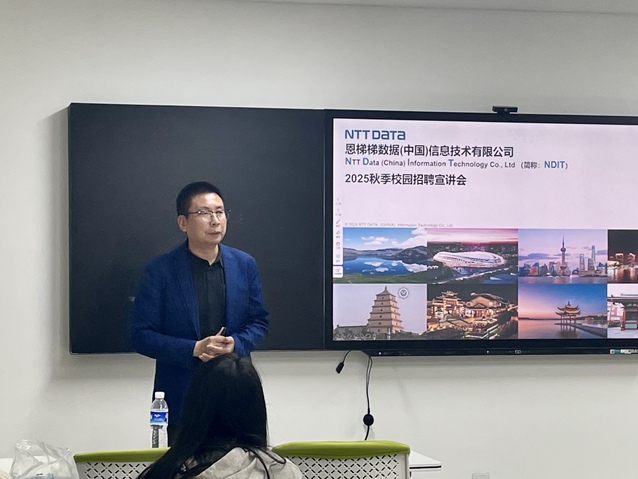 宣讲会上,NTT DATA(中国)信息技术有限公司人事部总经理岳剑峰通过播放企业宣传视频,向同学们全面展示了核心业务范畴、企业文化理念以及所在城市的整体发展情况。随后,岳经理详细阐述了公司的发展历程、各岗位职责、当前招聘计划、人才培养机制以及薪酬福利结构等内容,帮助毕业生们对公司整体情况和职业发展方向有了更为清晰的认识。