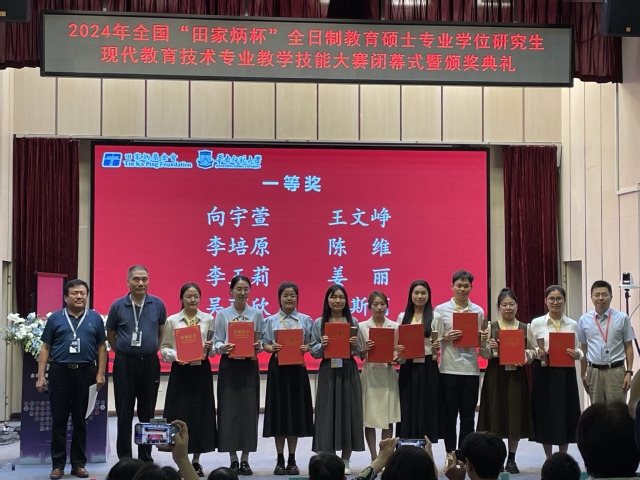 2024年11月8-10日,全国“田家炳杯”全日制教育硕士现代教育技术专业教学技能大赛总决赛在华南师范大学举行。我院4名2022级现代教育技术专业研究生在老师们的精心指导下,凭借扎实的教学功底和出色的现场表现,在众多参赛者中脱颖而出,取得了优异的成绩。研究生李宗欣荣获一等奖,段雨迪、高露荣获二等奖,吴新月荣获三等奖,王帆、王娟和安涛三位教师荣获“优秀指导教师”奖。