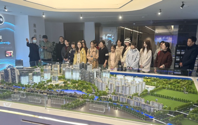 在淮海经济区金融服务中心,一行人参观了沙盘和一站式服务中心。引导员详细介绍了淮海经济区的区域概况、企业情况、发展历程、业态规划,毕业生们对淮海经济区金融服务业的发展现状和未来趋势有了更为直观且深入的了解。同时,在场师生还了解到金融服务中心的产业定位、发展目标、服务管理体系及金融党群服务中心的发展情况,这为毕业生们提供了宝贵的行业洞察,为未来的职业规划提供了有益参考。