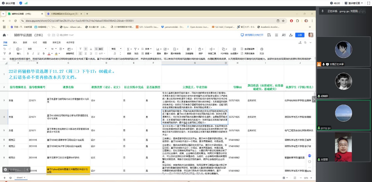 11月29日,计算机科学与技术系采用线上方式召开了关于双学位辅修专业毕业设计题目审核的讨论会。专业负责人刘亚丽教授、系主任支强老师、副系主任胡晓婷老师和巩固老师就辅修学生的毕业设计选题、题目审核标准以及指导工作进行了深入交流,会议由系主任支强老师主持。讨论重点包括如何确保毕业设计题目具有创新性与实践性,同时符合学科前沿和学生的专业背景。
