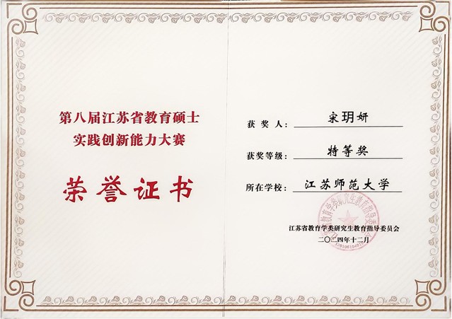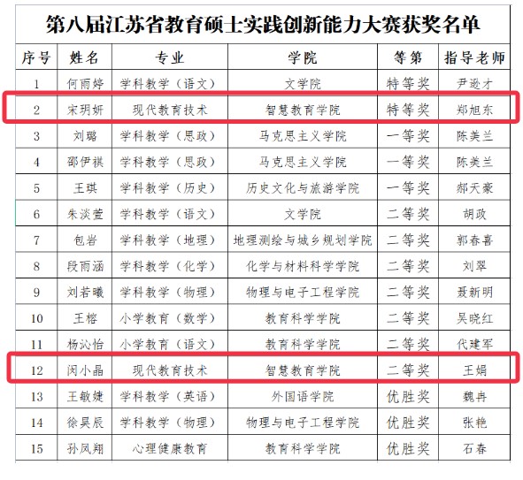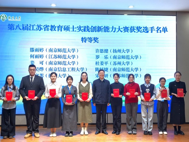2024年12月6日至8日,第八届江苏省教育硕士实践创新能力大赛在扬州大学(瘦西湖校区)举行。我院2名2023级现代教育技术专业研究生在老师们的精心指导下,凭借扎实的教学功底和出色的现场表现,在众多参赛者中脱颖而出,取得了优异的成绩: